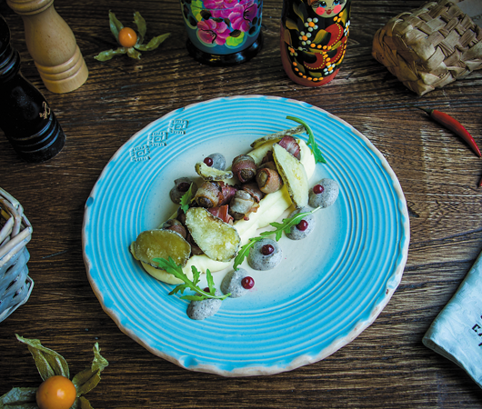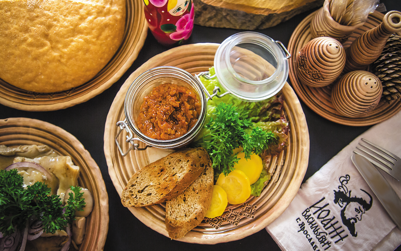 Также мы стараемся вводить в меню аутентичные блюда русской кухни, которые подчёркивают региональность с акцентом на локальный продукт. В меню есть специальный раздел «Царское меню», где представлены блюда из дорогих ингредиентов. Очень нравится гостям холодная закуска «Рыбный хлеб» с паштетом из печени трески и щучьей икрой, горячее блюдо «Царская чара» – тушеная вырезка кролика в сливках с грибами, беконом и белым вином, подаётся в ржаном хлебе. «Пулярды» – нежная курочка с белыми грибами под картофельной кашей и подкопчёной сметаной.