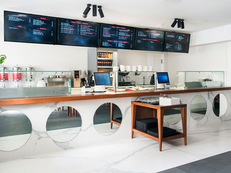 В ресторане сорок четыре посадочных места, его площадь 150 кв. метров.