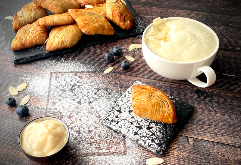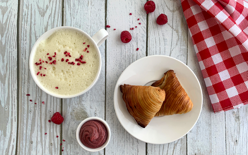 Золотистый румянец с утончённым звонким хрустом снаружи и нежная текстура с орехово‑цветочным и ягодным вкусом внутри сделают летний завтрак гостя незабываемым. Основа рецепта – бездрожжевое тесто и заварной крем на основе растительного напитка Planto Barista «Миндаль».
