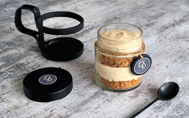 Это контейнер – банка-стакан с винтовой крышкой, съемным подстаканником и ложкой, которая крепится на съемную деталь легким движением руки. В данном контейнере можно продавать десерты – мобильные версии трайфла, любые торты, муссовые десерты, влажные кексы и ром-бабы в сиропе, йогурты, пудинги, желе, каши, детские фруктовые пюре и даже конфеты-трюфели.