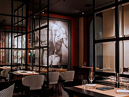 Ресторан рассчитан на пятьдесят посадочных мест, открытая кухня позволяет гостям видеть шеф-повара за работой. Интерьер оформлен с помощью металлическийартефактов геометрической формы, зрительно делящих зал на ячейки.