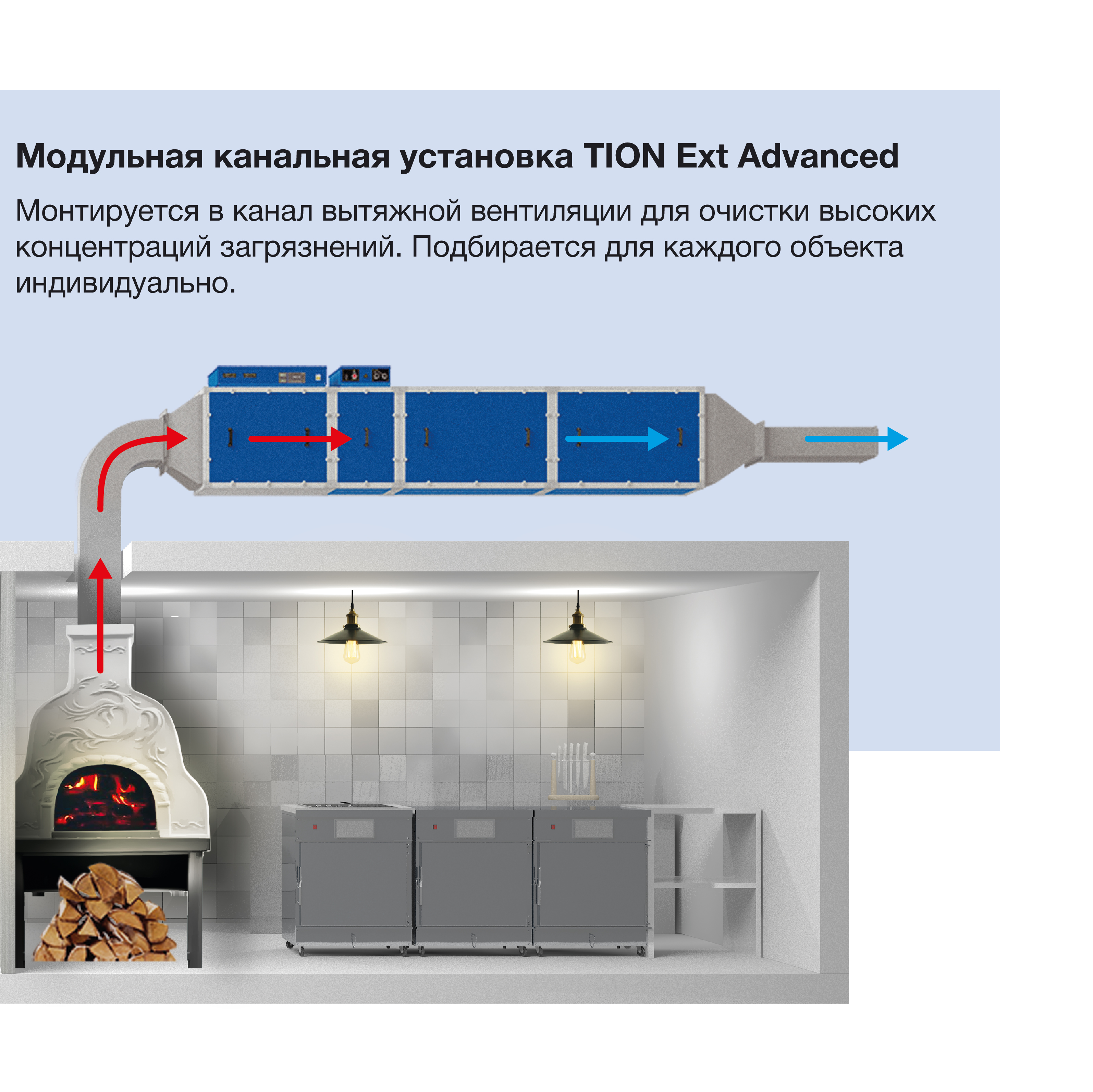 Канальный очиститель воздуха TION Ext Advanced встраивается в вентиляционный канал после вытяжных зонтов от кухонных плит, грилей, фритюрниц, мангалов, тандыров и другого кухонного технологического оборудования, предназначенные для снижения концентрации взвешенных частиц жира в воздухе (масляного тумана), дыма, сажи и других мелких и крупных аэрозолей.