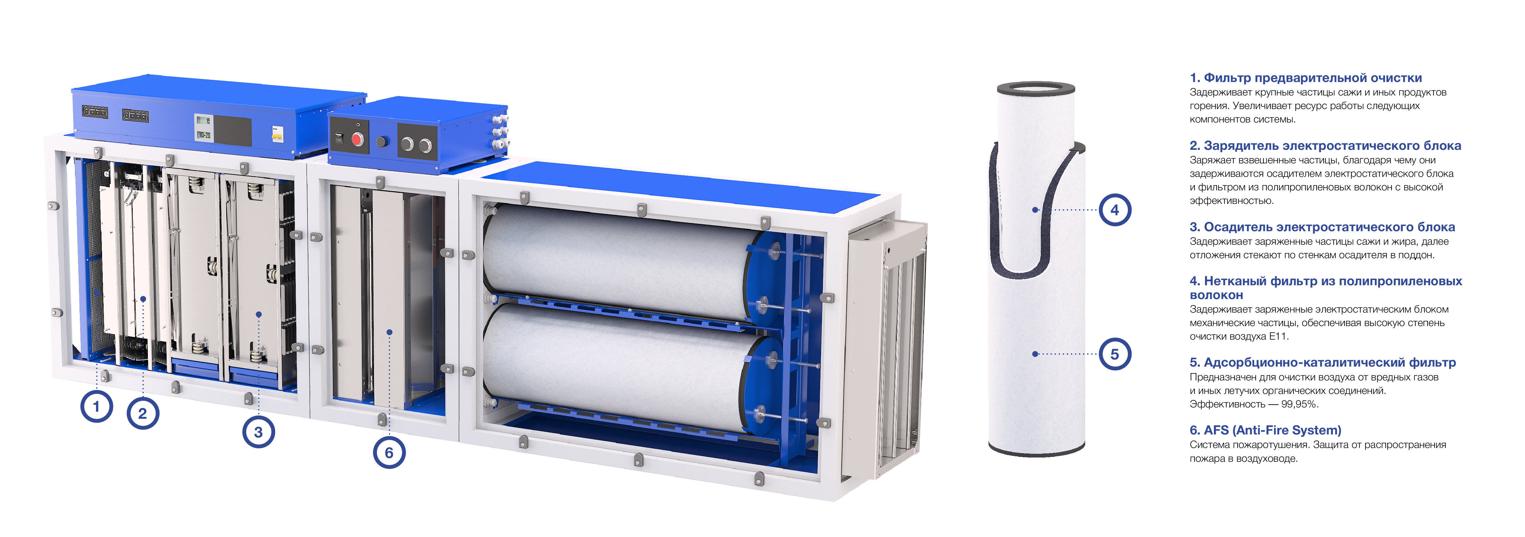 Семейство установок для очистки воздуха в системах вытяжной вентиляции зданий от дыма с кухонь, в том числе табачного, различных аэрозолей, газов, частиц, вредных веществ и запахов. Очищает воздух от любых сильных источников загрязнения, в том числе от продуктов выброса пароконвектоматов и всех видов печей (кроме дровяных), эффективно очищает выброс при производстве напитков и продуктов питания; может применяться для очистки воздуха от табачного дыма при организации мест курения и прочее.