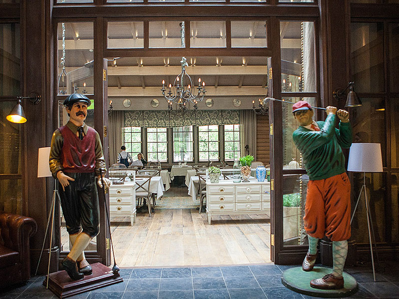 Внешне ресторан похож на уютный загородный дом — панорамные окна с видом на поле для гольфа и лес, камин, натуральные материалы в отделке, ковры, дачные цветы и большие люстры-свечи.
