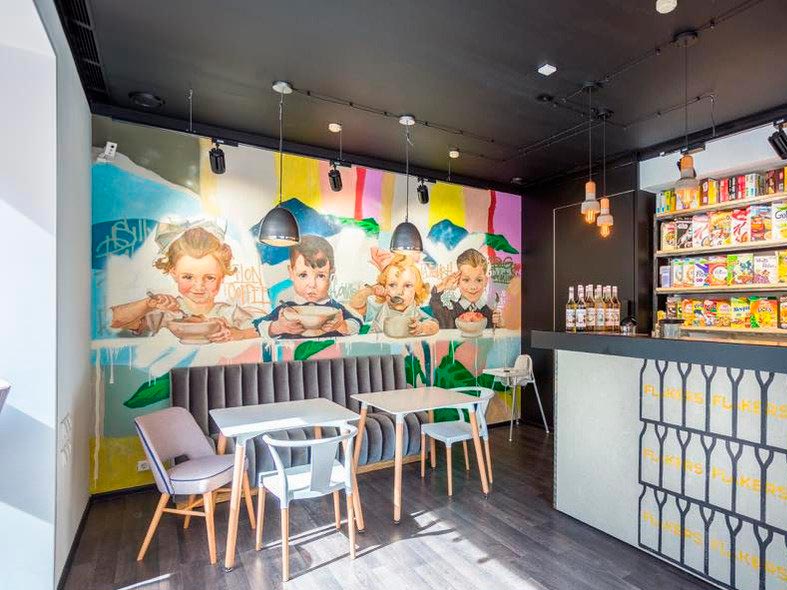 Стены кафе украшены изображениями детей из первой в мире рекламы хлопьев, появившейся в США в начале XX века.