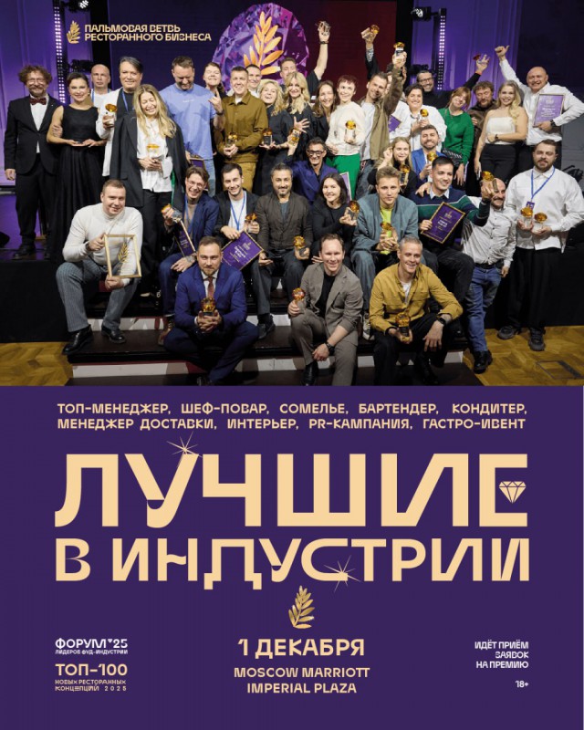 Напоминаем, что прием заявок на премию «Лучшие в индустрии» открыт до 10 октября. Самые достойные будут выбраны в 9-ти номинациях: топ-менеджер, шеф-повар, кондитер, сомелье, бартендер, менеджер доставки 2025, а также лучший интерьер, гастро-ивент и пиар-кампания года.