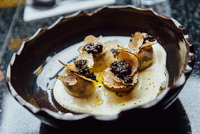 Молодой картофель с трюфельным кремом и осетровой икрой