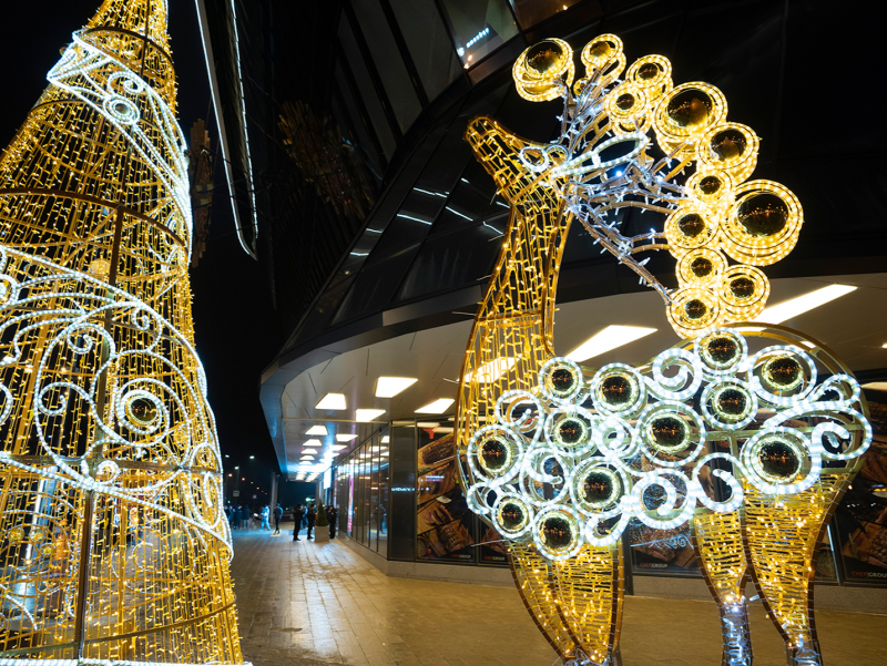 Внутренний интерьернового ТРЦ также преобразился: атриумы торговой галереи украшены подвесными полутораметровыми светящимися елочными шарами — в общей сложности их 20 штук. Кроме этого, на всех digital-поверхностях торгового центра (которых более 70) запущен праздничный контент. В дополнении к этому соответствующую праздничную атмосферу создают подборки из музыкального плейлиста.