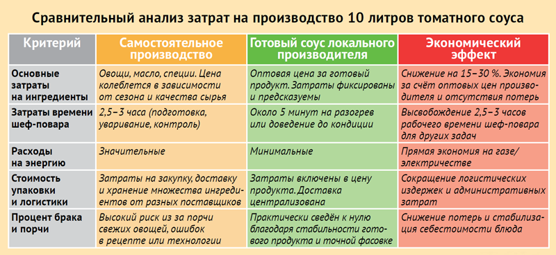 Чтобы наглядно оценить влияние перехода на готовые соусы, проведём сравнительный анализ на примере производства 10 литров томатного соуса для пиццы или пасты — одного из самых востребованных элементов меню (см. табл.).