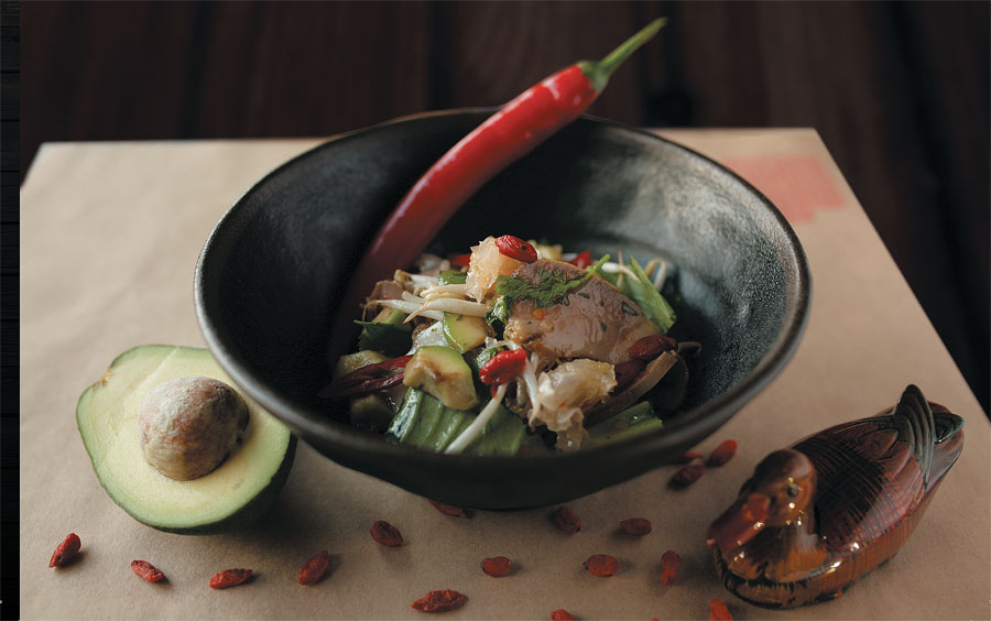 Салат готовится по принципу одной миски. Авокадо очистить, нарезать крупным кубиком, выложить на дно миски. Мини-капусту бок чой крупно порвать, добавить в салат. Затем перец чили, резаный кружочком, древесные грибы, ростки сои, утиное филе. Слегка перемешать, заправить кисло-сладким соусом, оформить ягодами годжи и кинзой.