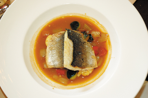 Собрать блюдо. Для этого выложить получившуюся смесь из овощей, хвостов лангустинов на четыре тарелки, сверху положить готового морского окуня. Можно подавать!