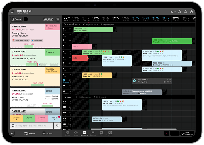 Для хостес — электронная книга резервов. Полная картина зала в реальном времени: схема, шахматка, статусы столов, заявки, звонки. Если стол свободен — это видно мгновенно, никаких отказов «на глаз». Брони, пересадки, продления, звонки и ссылка на оплату — всё в браузере или приложении на iOS, Android.