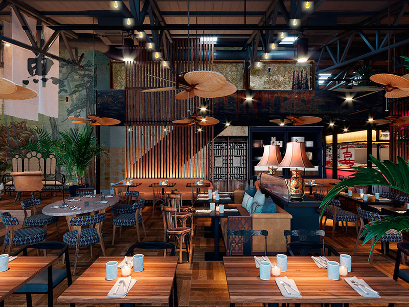 В ресторане выделят четыре зоны: фудмаркет у входа, коктейльный бар, стилизованный под вестибюль азиатского отеля, основной зал на шестьдесят мест и отдельное помещение на втором этаже, оформленное в стиле «азиатской квартиры», предназначенное для частных мероприятий, сообщает The Village.
