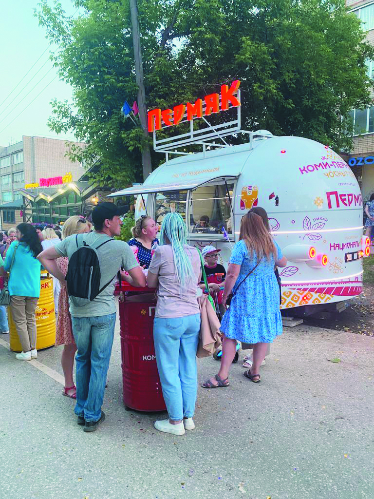 Не так давно один из наших предпринимателей, который занимается локальной кухней (у него ресторан «Националь» коми-пермяцкой национальной кухни), сделал два фудтрака, ещё два у него в производстве. Эти траки выкрашены в традиционные коми-пермяцкие цвета.