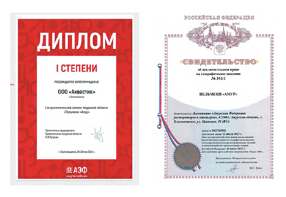 В 2024 году пельмени «Амур» официально получили свидетельство «об исключительном праве на географическое указание» от Роспатента. Регистрацию инициировала Амурская федерация рестораторов и отельеров, которая в течение десяти месяцев собирала архивные свидетельства, подтверждающие амурское происхождение этого популярного блюда.