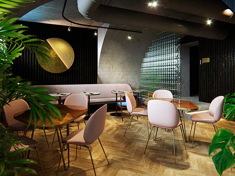 Интерьер ресторана объединяет японский минимализм с европейским модерном.