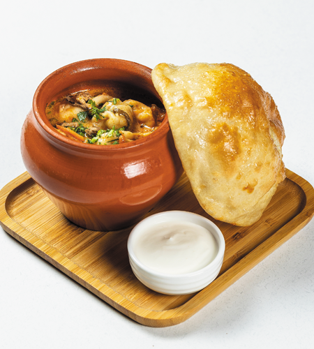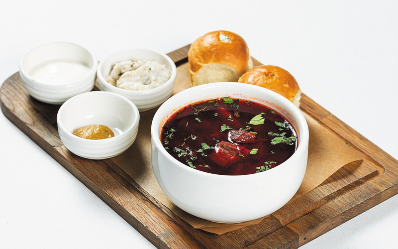 Помимо пельменей абсолютным хитом продаж в нашем заведении считается борщ – наваристый, ароматный, на вкусном мясном бульоне. Сразу отмечу, что борщ в каждом регионе разный, отличается не только по вкусу, цвету, аромату, но и технологией приготовления. На его вкусовые особенности влияют локальные продукты, и, конечно же, атмосфера заведения, подача борща. В нашем ресторане мы подаём борщ с мягкой пампушкой, внутри которой запечатано сливочное масло с чесноком. Ко всей этой истории также идёт прокрученное сало, которое можно намазать на чесночную булочку, горчица и сметана.