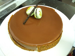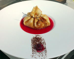 Блинчик с шоколадно-жасминовым эспумэ, вишневым соусом и пьяной вишней