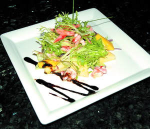 Салат c креветками, манго и рукколой