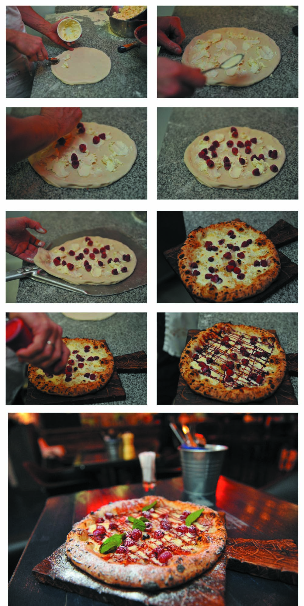 На заготовку выложить свежую малину, кнели маскарпоне и выпечь в дровяной печи чуть больше, чем обычные 1,5 минуты. Малина при этом подпекается, становясь крайне насыщенного вкуса, а маскарпоне растекается.