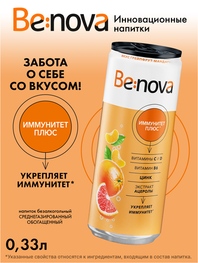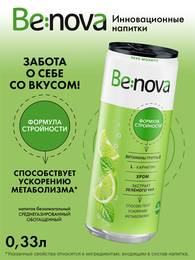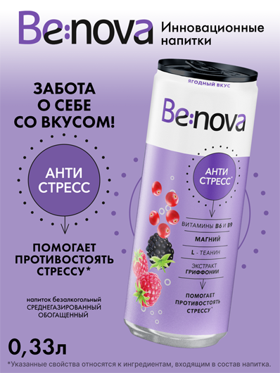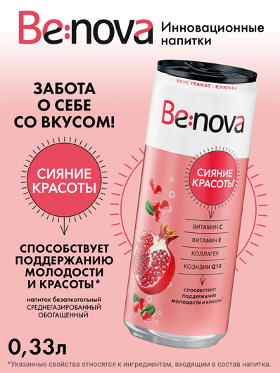 Недавно в наших барах появился новый бренд функциональных напитков, поставляемых нашим партнёром – компанией «Перспектива». Это полезные напитки Be:nova с востребованным функционалом и богатым составом. Витамины, минералы и растительные экстракты, входящие в их состав – всё на пользу здоровью современного поколения. В нашем ассортименте 4 ярких вкуса этого напитка с различным функционалом: