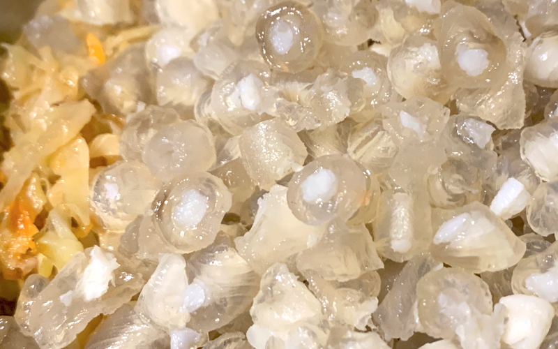 Визига с/з 500 г Соль морская 30 г Перец 10 г. Визигу разморозить, промыть, замочить в холодной воде на 3-4 часа. Слить воду, залить визигу прохладной водой, посолить и варить до готовности 2,5-3 часа. За 30 минут до завершения варки поперчить. Скинуть визигу на дуршлаг, слегка охладить и нарезать на мелкие кусочки.