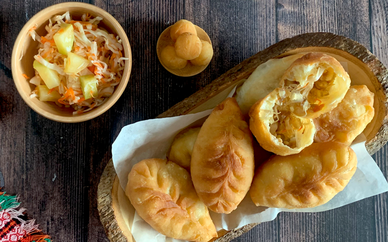 Капуста свежая 350 г Капуста квашеная 300 г Визига варёная 400 г Масло растительное 40 г Капусту шинкуем мелко, обжариваем на сковороде, не накрывая крышкой. То же самое проделываем с квашеной капустой, предварительно удалив из неё кусочки фруктов. Объединяем обжаренные полуфабрикаты с визигой, перемешиваем.