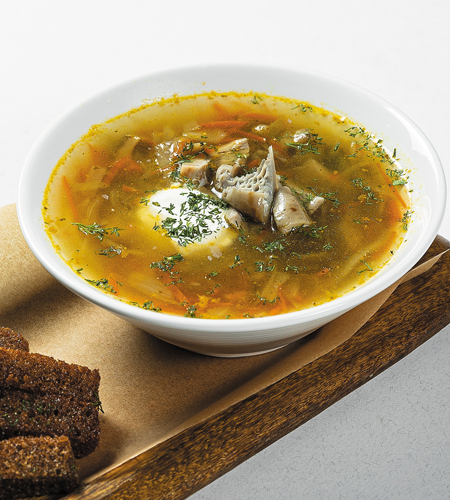 Помимо пельменей абсолютным хитом продаж в нашем заведении считается борщ – наваристый, ароматный, на вкусном мясном бульоне. Сразу отмечу, что борщ в каждом регионе разный, отличается не только по вкусу, цвету, аромату, но и технологией приготовления. На его вкусовые особенности влияют локальные продукты, и, конечно же, атмосфера заведения, подача борща. В нашем ресторане мы подаём борщ с мягкой пампушкой, внутри которой запечатано сливочное масло с чесноком. Ко всей этой истории также идёт прокрученное сало, которое можно намазать на чесночную булочку, горчица и сметана.