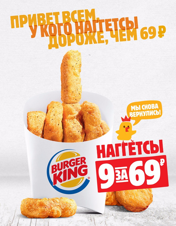 В середине мая стало известно о запуске новой рекламной кампании Burger King. Сеть ресторанов быстрого питания представила рекламу новой акции «Наггетсы за 69 рублей», в которой «послала» конкурентов с помощью неприличного жеста, сложенного из куриных наггетсов. Картинка сопровождается подписью «Привет всем, у кого наггетсы дороже».