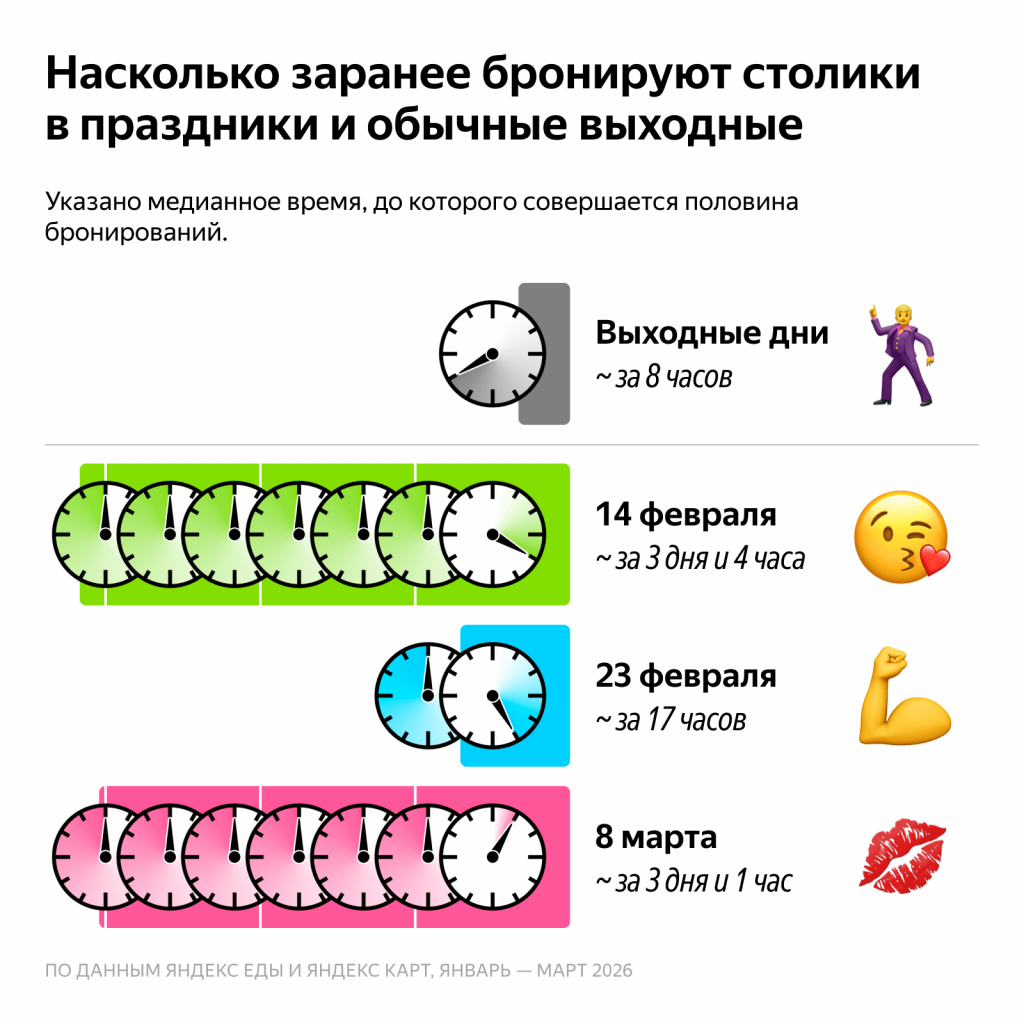 В обычные выходные половина пользователей бронируют столик в среднем за 8 часов до визита — как правило, утром на вечер того же дня. На 14 февраля и 8 марта столики в среднем бронируют за трое суток до визита — это в 10 раз раньше, чем в обычные выходные. На 23 февраля планируют чуть менее заблаговременно — за 17 часов, но это всё равно в 2,3 раза раньше обычного.