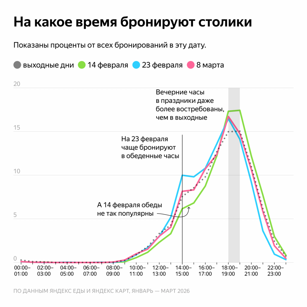 В праздники большинство столиков бронируют на вечер — с 18:00 до 20:00. Но есть и второй по популярности временной слот — с 14:00 до 15:00. Обеденное время особенно востребовано 23 февраля: каждое десятое бронирование приходится именно на эти часы. 8 марта и в обычные выходные обед тоже востребован. А вот 14 февраля — исключение: в День всех влюблённых в рестораны реже идут на обед, предпочитая романтический ужин.