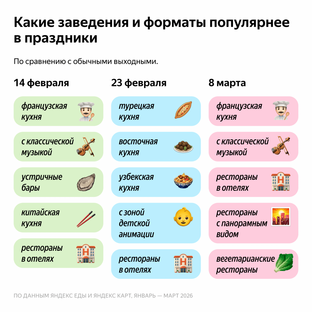 В праздничные даты особенно заметен романтический тренд в выборе заведений: и 14 февраля, и 8 марта пользователи чаще обычного бронировали рестораны французской кухни, заведения с классической музыкой и рестораны при отелях — места с более камерной и праздничной атмосферой. При этом в День святого Валентина дополнительно рос интерес к устричным барам и ресторанам китайской кухни, а 8 марта — к местам с панорамным видом и вегетарианским заведениям. В то же время 23 февраля гости чаще выбирали рестораны с более сытной кухней — например, турецкой, восточной и узбекской.