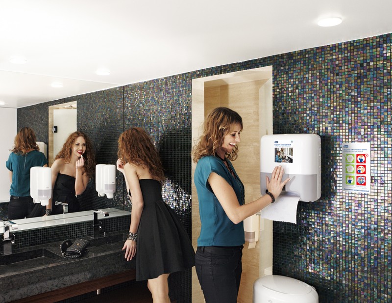 Специалисты Tork предлагают разместить наклейки на гигиенических диспенсерах для бумажных полотенец, а постеры в туалетных комнатах и офисных столовых.